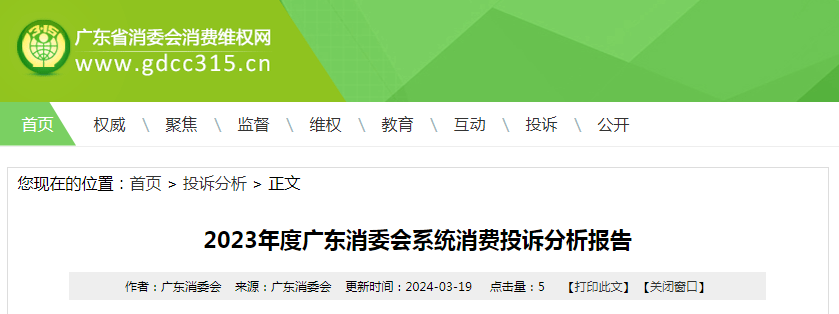 广东是消费大省,消费人口、消费总额多年全国第一,2023年广东消费恢复和增长态势明显,社会消费品零售总额4.75万亿元、增长5.8%,居民人均消费支出34331元、增长6.7%。伴随消费持续复苏和扩大,消费投诉数量出现了增长。2023年广东消委会系统全年处理消费者投诉531719件,同比增长32.85%,增加131482件,总量首次突破50万件。全省消费投诉主要集中在珠三角地区,广州、深圳、珠海、佛山、东莞、中山、肇庆和省消委会本部共处理投诉51.76万件,占总量97.35%,消费市场活跃以及投诉渠道畅通、维权工作力度大是相关地区投诉量较大的主要原因。