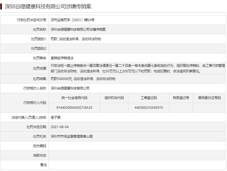 中国经济网北京9月17日讯 深圳市市场监督管理局日前发布的行政处罚决定书《深圳谷缇健康科技有限公司涉嫌传销案》深市监南罚字〔2021〕稽54号显示,深圳谷缇健康科技有限公司存在直销或传销违法的行为,依据《禁止传销条例》第四章第二十四条规定,深圳市市场监督管理局南山局决定对其罚款50万元,没收违法所得、没收非法财物,处罚日期为8月4日。