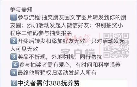 “当时我转发的时候,参与要求里没有‘中奖者需付388元抚养费’,但11月3日抽奖前,商家加了这么一条要求。”刘女士翻出了11月3日的朋友圈截图,与11月1日的截图对比,确实多了“中奖者需付388元抚养费”这一条要求,其他的都一样。