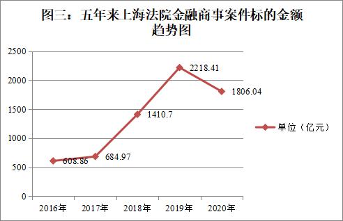 2020年,上海法院受理一审金融商事案件标的总额有所下降,为人民币1,806.04亿元(以下币种相同),同比下降18.58%(图三)。