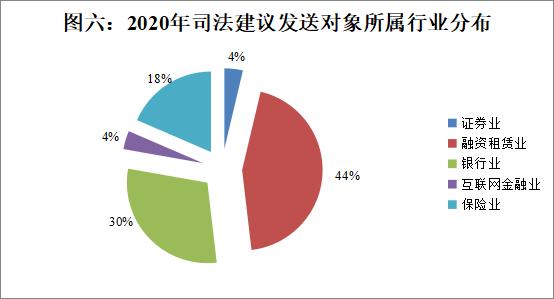 近年来,银行、保险、融资租赁等行业是法院发送司法建议较多的金融领域。2020年上海法院发出的金融类司法建议涉及融资租赁业12份,银行业8份,保险业5份,证券业与互联网金融领域各1份。(图六)