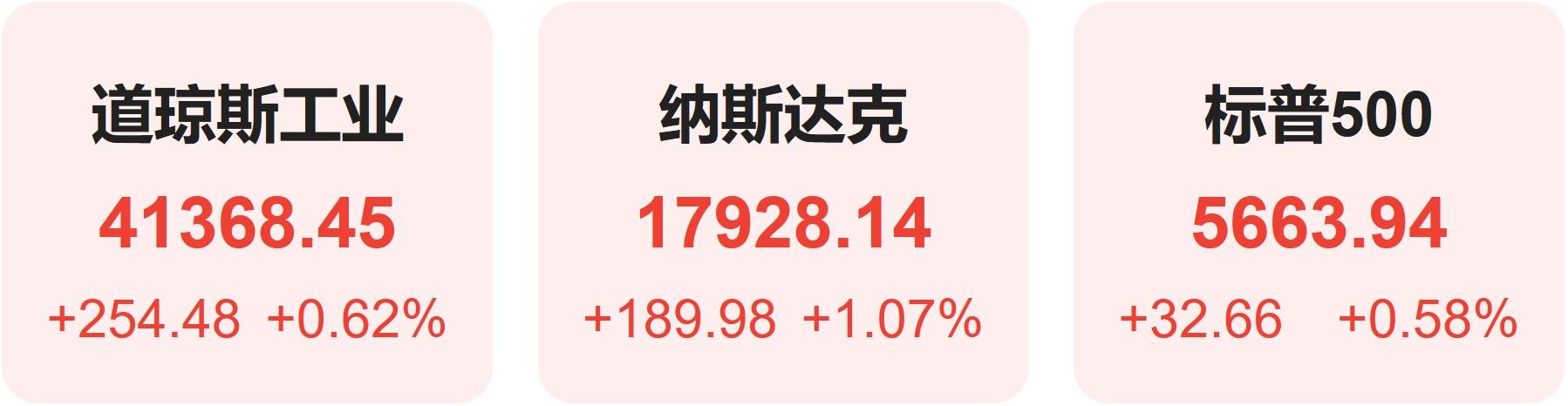 截至收盘,标普500指数涨0.58%,报5663.94点;道琼斯指数涨0.62%,报41368.45点;纳斯达克指数涨1.07%,报17928.14点。