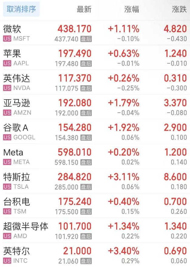 热门美股中,微软涨1.11%,苹果涨0.63%,英伟达涨0.27%,亚马逊涨1.79%,谷歌C涨1.93%,谷歌A涨1.92%,Meta涨0.20%,特斯拉涨3.11%,台积电涨0.40%,超微半导体涨1.34%。