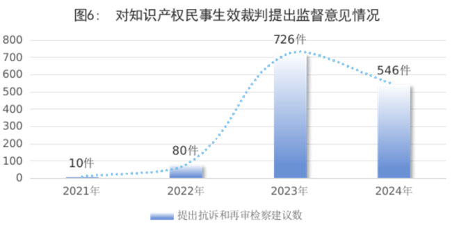 3.深化知识产权恶意诉讼监督。依职权启动知识产权虚假诉讼监督558件,提出抗诉26件,提出再审检察建议407件。部分地区积极运用恶意诉讼法律监督模型发现线索,对滥用权利、虚假诉讼等情形开展法律监督。