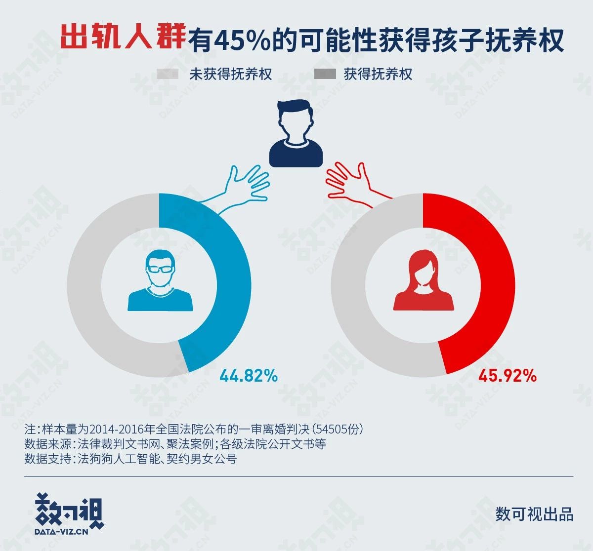 同时,即使出轨,父母有45%的可能性获得孩子抚养权。出轨仅仅涉及违背“忠实”的法律义务,与孩子抚养无直接关联。