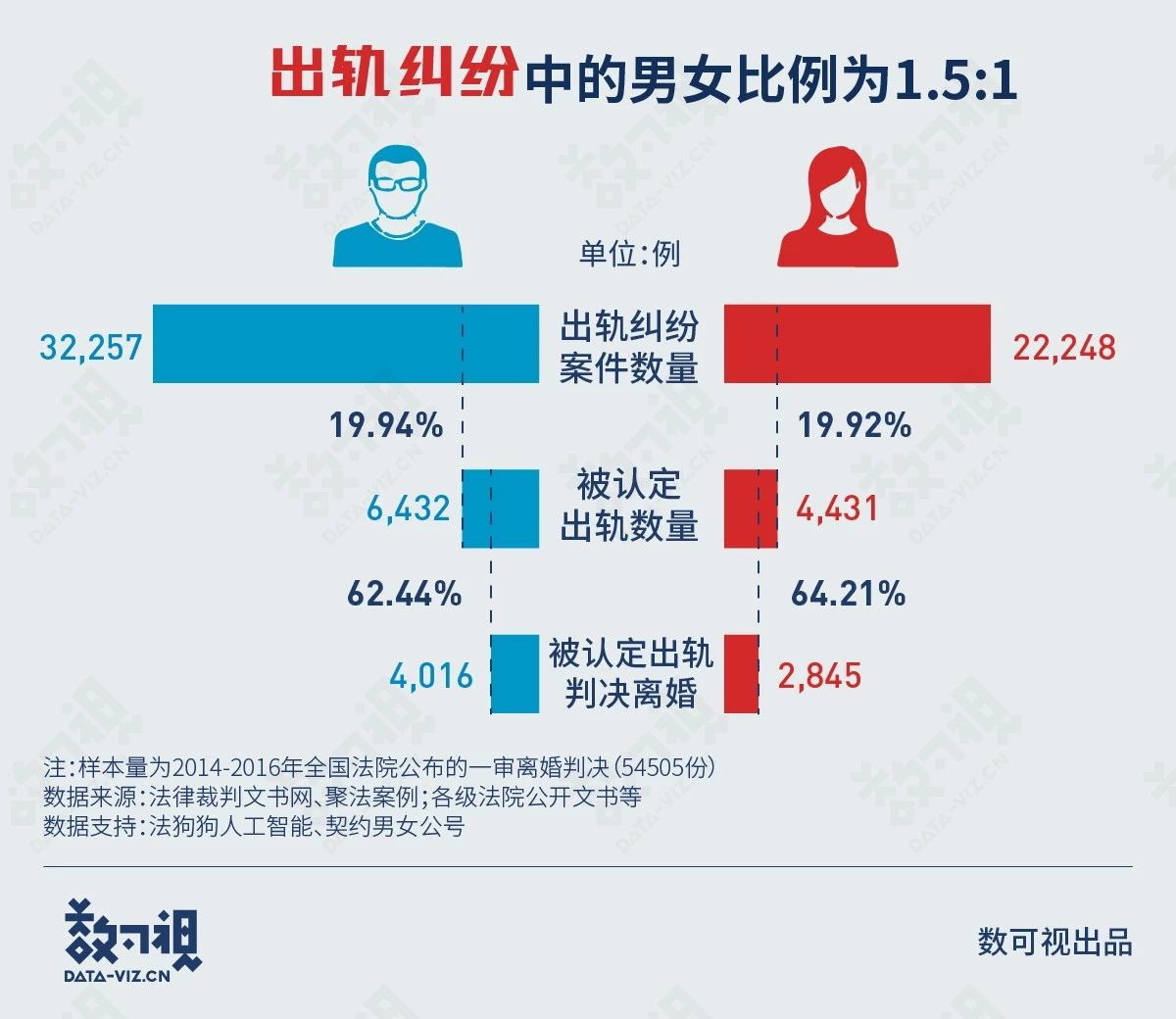 根据中国人民大学性社会学研究所所长潘绥铭的研究,中国丈夫和妻子的出轨比例大约在2.5:1。但根据出轨纠纷案件显示,男性和女性的出轨比例大概是1.5:1,即在认为出轨后对峙公堂这件事情上,男女的差异性并不高,有一个可能的解释是,当男性出轨时,女性更倾向原谅,而非对峙公堂。