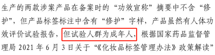 其中,在2021年5月至2022年6月期间,这两款产品在备案的“功效宣称”并未包含“修护”字样,然而其产品标签上却标注了“修护”。尽管这两款产品有人体功效评价试验报告,但试验对象仅限于成年人。