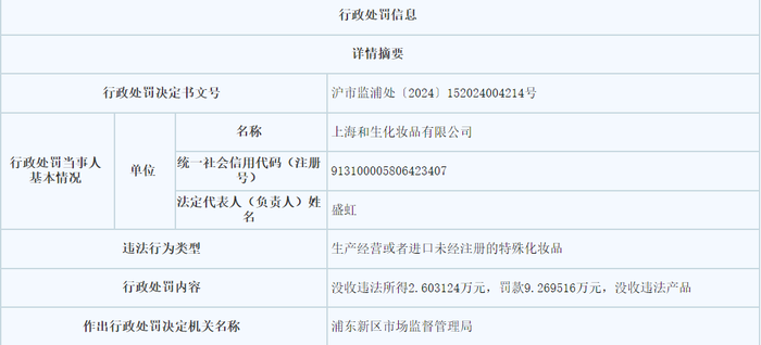 近日,聚美丽从上海药品监督管理局获悉,上海和生化妆品有限公司(以下简称:上海和生)因生产标签不符合规定的普通化妆品、生产未经注册的特殊化妆品,从而被上海市浦东新区市场监督管理局(以下简称:上海浦东市监局)累计罚没9.27万元、没收违法所得2.6万元。