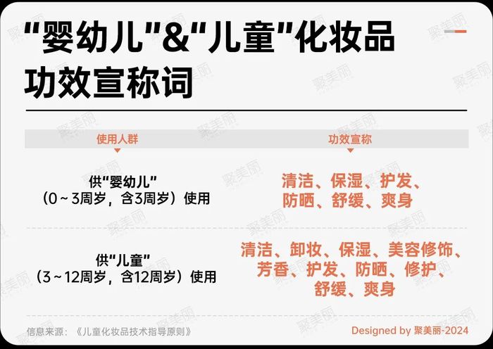 回到本次上海和生问题,针对宣称规范,据《儿童化妆品技术指导原则》信息显示,供“婴幼儿”(0~3周岁,含3周岁)使用产品的功效宣称词被严格限制在“清洁、保湿、护发、防晒、舒缓、爽身”这六个方面。而供“儿童”(3~12周岁,含12周岁)使用的产品,其功效宣称词则相对宽泛一些,包括“清洁、卸妆、保湿、美容修饰、芳香、护发、防晒、修护、舒缓、爽身”十个方面。