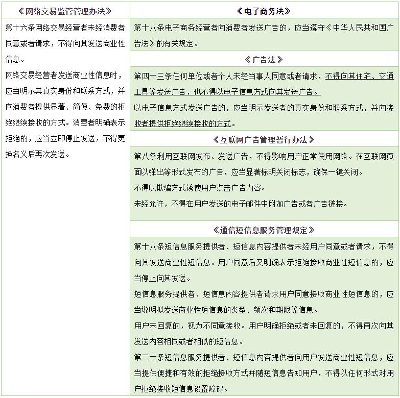 《办法》第十六条吸收《广告法》规定,要求网络交易经营者未经消费者同意或者请求,不得向其发送商业性信息。网络交易经营者发送商业性信息时,应明示其真实身份和联系方式,并向消费者提供显著、简便、免费的拒绝继续接收的方式。消费者明确表示拒绝的,应立即停止发送,不得更换名义后再次发送。而网络交易经营者发送商业性信息还需根据其广告形式,比如弹窗广告、电子邮件或短信息等,遵循《互联网广告管理暂行办法》《通信短信息服务管理规定》的相关要求。