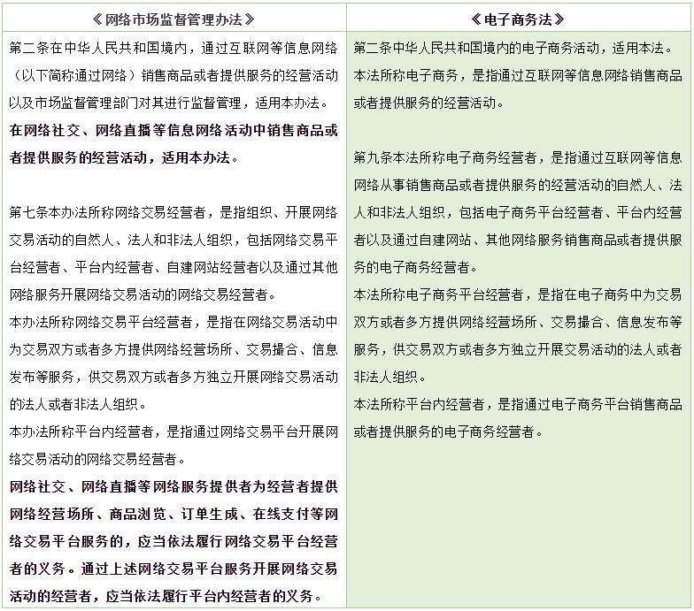 《电子商务法》第三条指出,国家鼓励发展电子商务新业态,创新商业模式。目前法律并未对网络交易平台经营者与平台内经营者的边界进行严格限定。2020年11月,市场监管总局曾发布《关于加强网络直播营销活动监管的指导意见》,其中规定,网络平台为采用网络直播方式销售商品或提供服务的经营者提供网络经营场所、交易撮合、信息发布等服务,供交易双方或多方独立开展交易活动的,特别是网络平台开放网络直播推广服务经营者入驻功能、为采用网络直播方式推广商品或服务的经营者提供直播技术服务的,应按照《电子商务法》规定履行电子商务平台经营者的责任和义务。