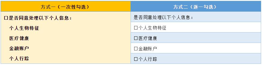 本团队认为,“逐项同意”是在“单独同意”基础上对网络交易经营者提出的更高要求。“单独同意”强调个人信息处理者在处理个人信息时,不能要求个人信息主体一次性同意包括一般个人信息与个人敏感信息在内的所有个人信息处理活动,而应在获取个人信息主体对一般个人信息处理行为的同意基础上,对敏感个人信息的处理行为作出显著提示,在个人信息主体明确知晓后作出是否同意的决定。而依据《办法》第十三条的规定,在网络交易场景中,“对敏感个人信息的处理行为作出显著提示”的具体方式体现为“逐项同意”。网络交易经营者出于合法目的处理敏感个人信息时,不仅需再次获取个人信息主体的同意,还需对所涉及的不同种类的敏感个人信息一一获取个人信息主体的同意,类似于下表举例中的方式二,从而给予网络交易场景中消费者更为灵活的自主选择权。