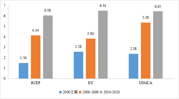 我们使用Dür等构建的DESTA数据库,对1948—2020年RCEP、EU和USMCA三大区域签署RTA的平均深度进行量化,结果可见图1。从区域来看,欧盟作为发达国家集合体,签署RTA的深度最高,近十年平均深度为6.54,表明其贸易协定涉及的条款内容较多、自由化程度较高。RCEP区域由于同时涵盖发达国家和发展中国家,RTA深度相对较低,近十年平均深度为6.08,但与欧盟和美墨加等发达地区的差距正在逐年缩小。从时间来看,各区域签署RTA的平均深度均呈上升趋势,表明全球范围内RTA的质量正在不断提升。
