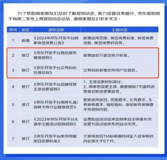 与此同时,京东开放平台近日宣布对售后服务管理规则进行调整,其中最引人注目的是新增的退款不退货执行标准。据悉,该规则将于12月29日正式生效。与此同时,《京东开放平台交易纠纷处理总则》也进行了更新,新增了对用户仅退款的支持,该调整已于今日生效。