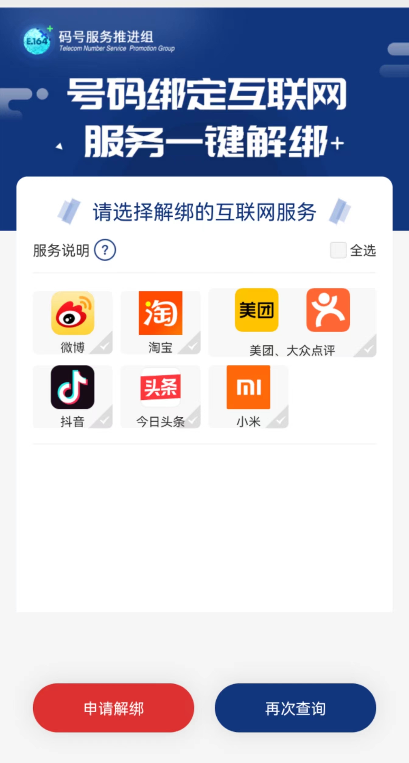 中国信息通信研究院旗下微信公众号“一号通查”截图。 人民网北京6月8日电 (记者申佳平)你知道自己的手机号绑定了哪些APP吗?有办法统一解绑吗?据中国信息通信研究院(以下简称“中国信通院”)消息,其旗下微信公众号“一号通查”推出手机号“一键解绑”服务,可解除本人持有号码前(即号码注销重启前)号码注册绑定的互联网账号关联关系(本人持有号码期间绑定的互联网账号不受影响),覆盖微博、淘宝、抖音、今日头条、美团、大众点评、小米生态等互联网应用。…