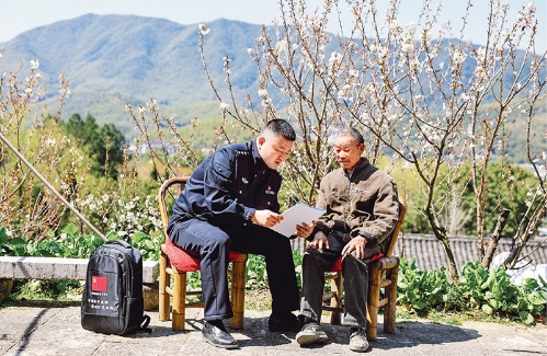 近年来,各地公安机关践行新时代“枫桥经验”,创新开展“背包警务”等工作模式,为基层群众排忧解难,推动矛盾纠纷化解。图为2025年3月21日,浙江省余姚市公安局梁弄派出所民警通过“背包警务”进村入户,开展安全防范宣传。新华社记者 江汉/摄