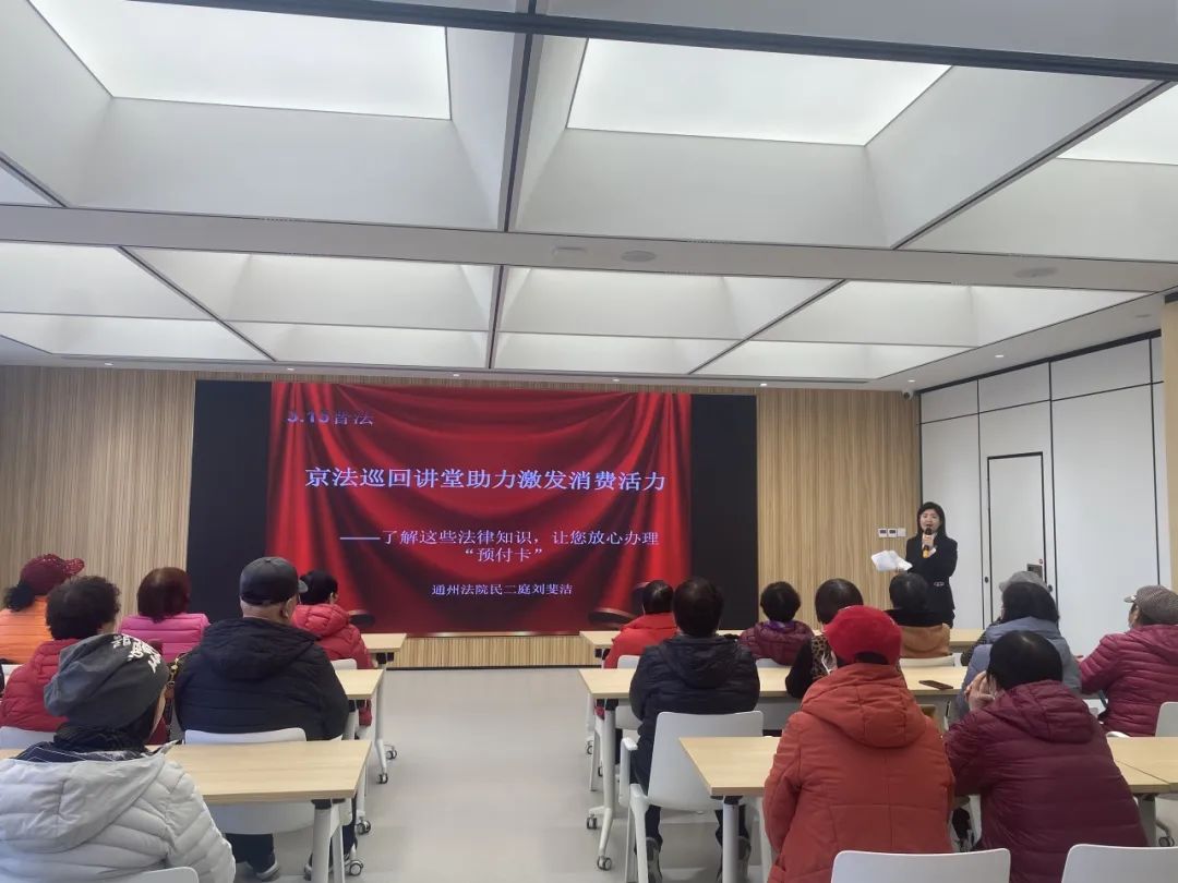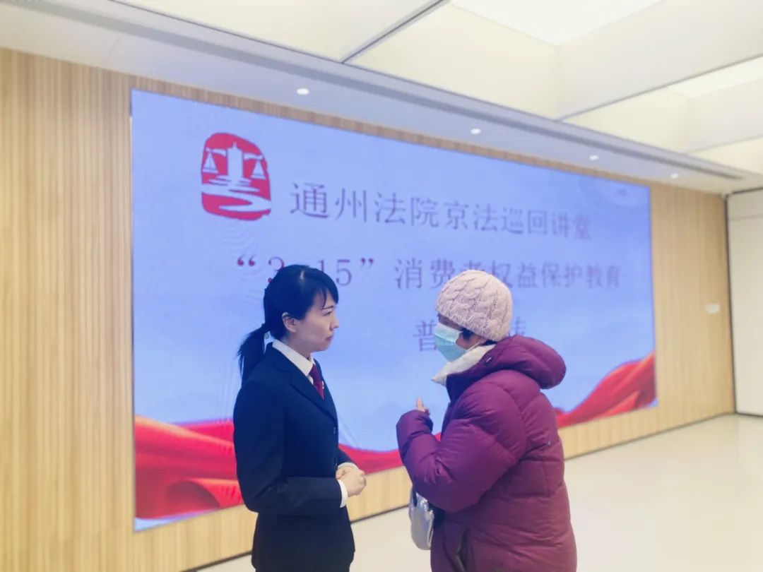 在3.15“国际消费者权益日”来临之际,为积极营造有利于消费升级的法治环境,便于人民群众安心消费、放心消费,切实增强人民群众的安全感、获得感和幸福感,通州法院民二庭副庭长吴可加带领法官助理马国磊、刘斐洁、刘晓静前往文景街道综合文化中心开展“京法巡回讲堂”活动,结合居民们的实际需求,“面对面、心贴心”地开展“订单式”普法。