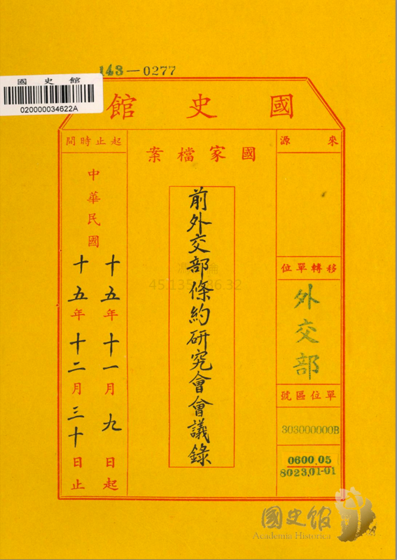 “国史馆”藏的这批档案共包括4部分,主体是“前外交部条约研究会会议录”,共11卷,其中020-990600-0126卷是条约研究会成立大会至第6次常会的会议记录,020-990600-0127卷是条约研究会第7至12次常会的会议记录,020-990600-0128卷是条约研究会第13至18次常会的会议记录,020-990600-0129卷是条约研究会第19至23次常会的会议记录,020-990600-0130卷是条约研究会第24至27次常会的会议记录,020-990600-0131卷是条约研究会第28至31次常会的会议记录,020-990600-0132卷是条约研究会第32至35次常会的会议记录,020-990600-0133卷是条约研究会第36至38次常会的会议记录,020-990600-0134卷是条约研究会第39至42次常会的会议记录,020-990600-0135卷是条约研究会第43至46次常会的会议记录,020-990600-0136卷是条约研究会第47至48次常会的会议记录。另外,020-990300-0026卷是“前外交部条约研究会人员任用”,收录了该会部分顾问、办事人员的聘用函;020-990200-0001卷是“前外交部条约研究会经费”,收录了该会月度经费的收入情况,以及支付给部分人员的津贴与夫马费的情况;020-990600-0137卷是“前外交部条约研究会开会通知”,收录了每次开会开会通知及会议讨论主题的情况。