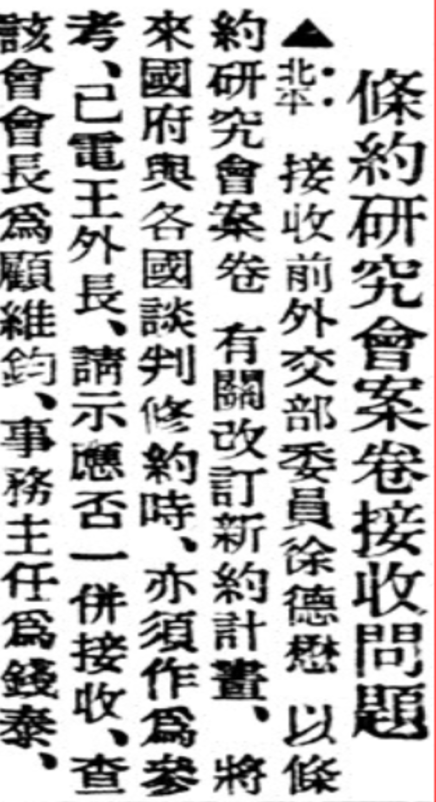 (2)有助于学界加深对近现代中外条约关系的研究。条约研究会讨论的范围既包括了如何应对中比、中西、中日、中法、中墨等旧约的修订工作,还涉及到对关税、法权、航权、最惠国等问题的认识,特别是其中关于取消治外法权与开放内地等问题的讨论,揭示了中外条约关系对中国社会的深刻与复杂影响。
