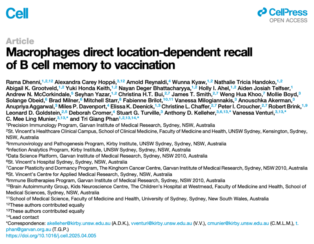 2025 年4月28日,澳大利亚Garvan医学研究所的研究人员在国际顶尖学术期刊Cell上发表了题为:Macrophages direct location-dependent recall of B cell memory to vaccination 的研究论文。