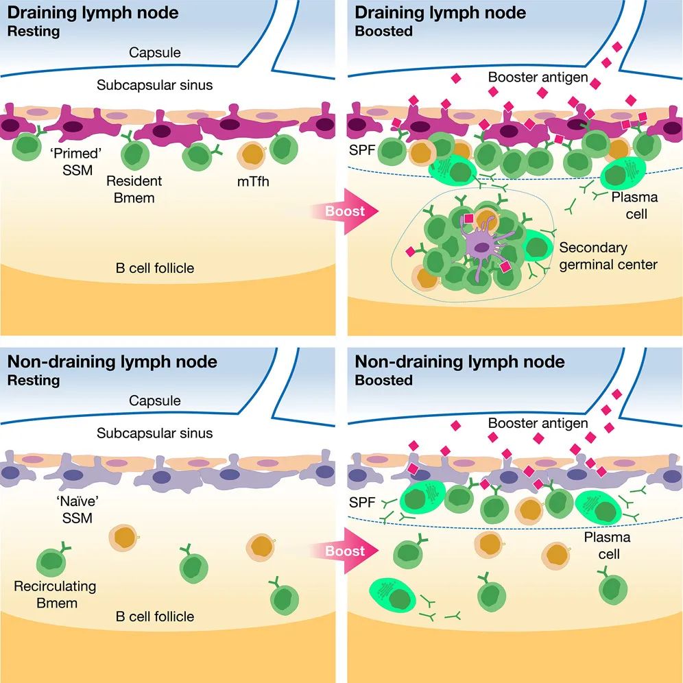 这些发现揭示了预激活的引流淋巴结中被膜下窦巨噬细胞(SSM)在记忆 B 细胞(Bmem)细胞命运决定中发挥了未被重视的作用。