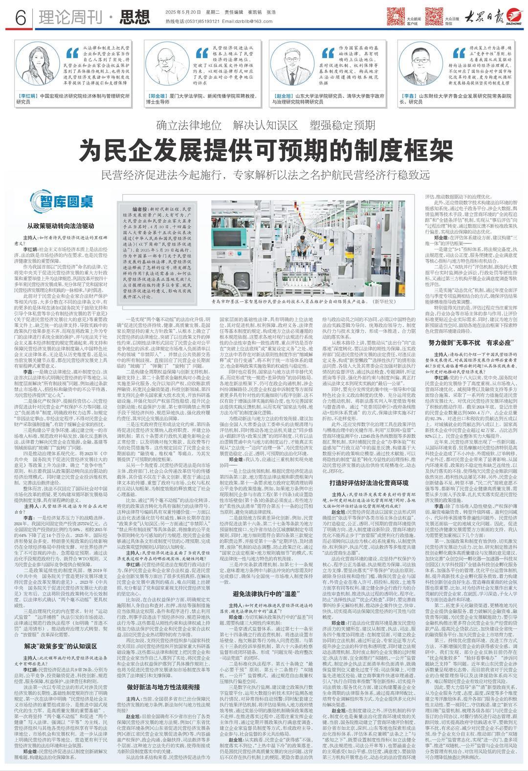 编者按:新时代新征程,民营经济发展前景广阔、大有可为,广大民营企业和民营企业家大显身手正当其时。4月30日,十四届全国人大常委会第十五次会议表决通过《中华人民共和国民营经济促进法》(以下简称“民营经济促进法”),自2025年5月20日起施行。作为中国第一部专门关于民营经济发展的基础性法律,民营经济促进法释放了怎样的信号,将发挥怎样的作用?良法还需善治,如何让民营经济促进法真正落地见效?大众日报理论版约请多位专家,就民营经济促进法的意义、影响及实践展开深入讨论。