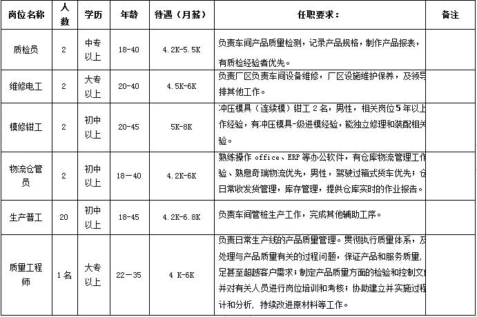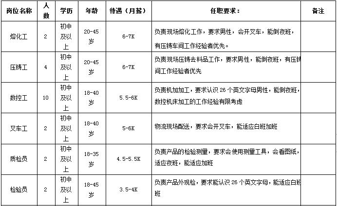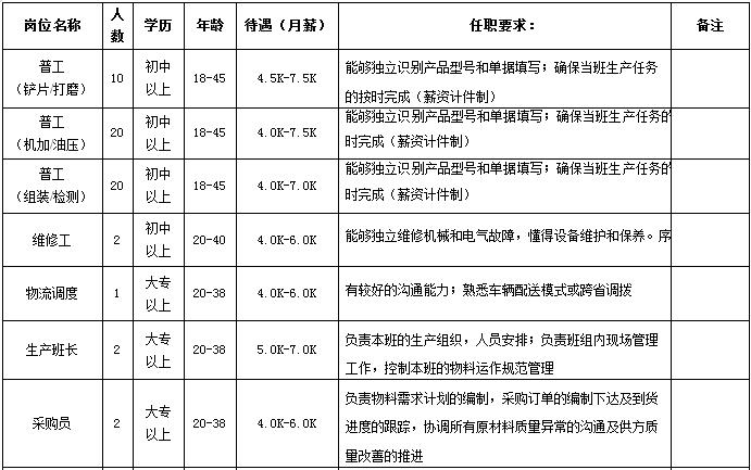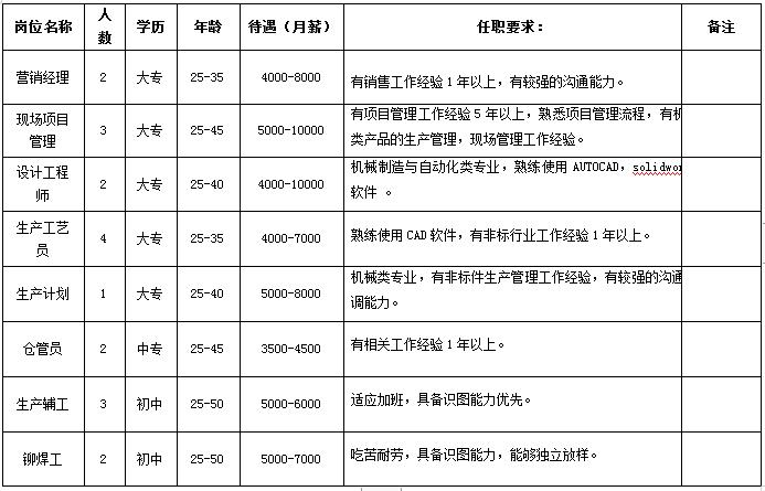 公司是一家专业从事机械加工,集设计、生产、组装、销售和服务于一体的发展中生产和销售厂家。拥有多台精密机加工设备和检测设备,公司主要业务为汽车零配件及其它小型镁铝合金、球墨铸铁件的加工与工装夹治具、检具等设计加工。现因公司业务发展的需要,特招聘以下人员: