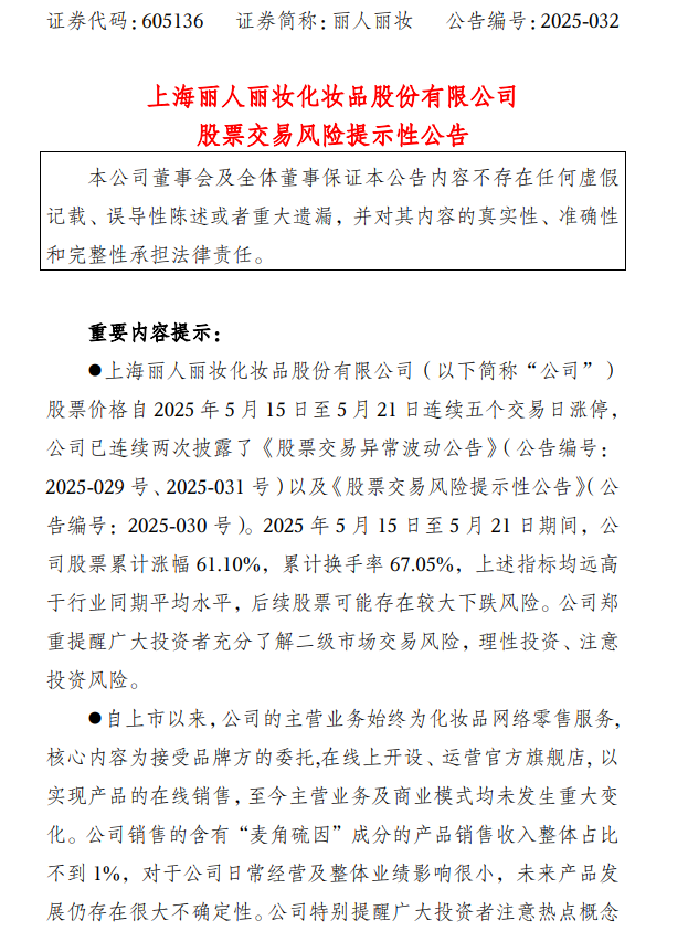 同日晚间,三连板的浪莎股份发布股票交易风险提示公告称,上市公司基本面未发生改变,公司估值明显高于同行业平均水平,公司股价存在被炒作风险。另据记者统计,4月9日至今,该股累计涨幅超82%。