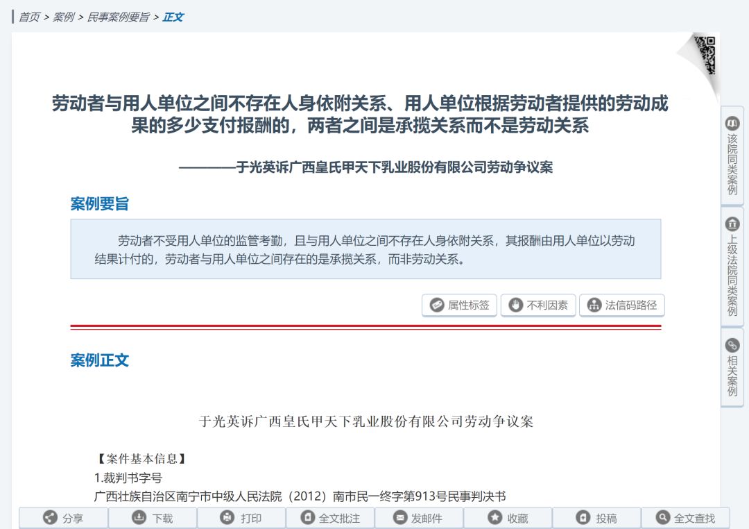 案例要旨:最劳动者不受用人单位的监管考勤,且与用人单位之间不存在人身依附关系,其报酬由用人单位以劳动结果计付的,劳动者与用人单位之间存在的是承揽关系,而非劳动关系。