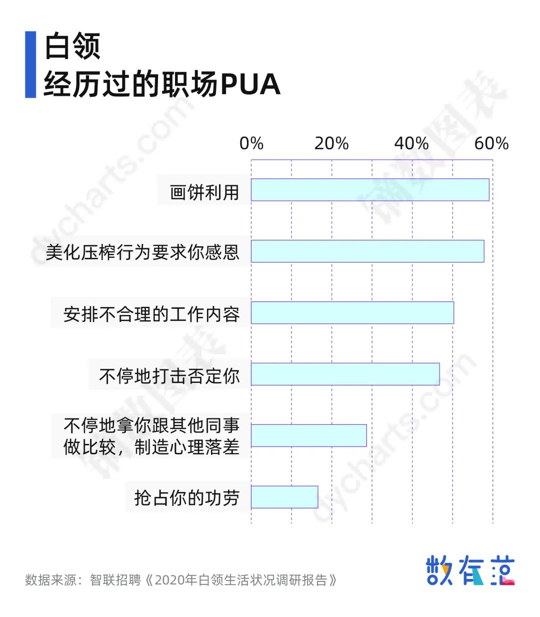 根据智联招聘发布的《2020年白领生活状况调研报告》,超过63%的受访者表示曾遭遇过职场PUA。职场PUA的主要套路包括领导对员工画饼利用(画饼指的是领导说话不算话,给一些不着边际的承诺)、美化压榨行为要求感恩还有安排不合理的工作内容等方面。