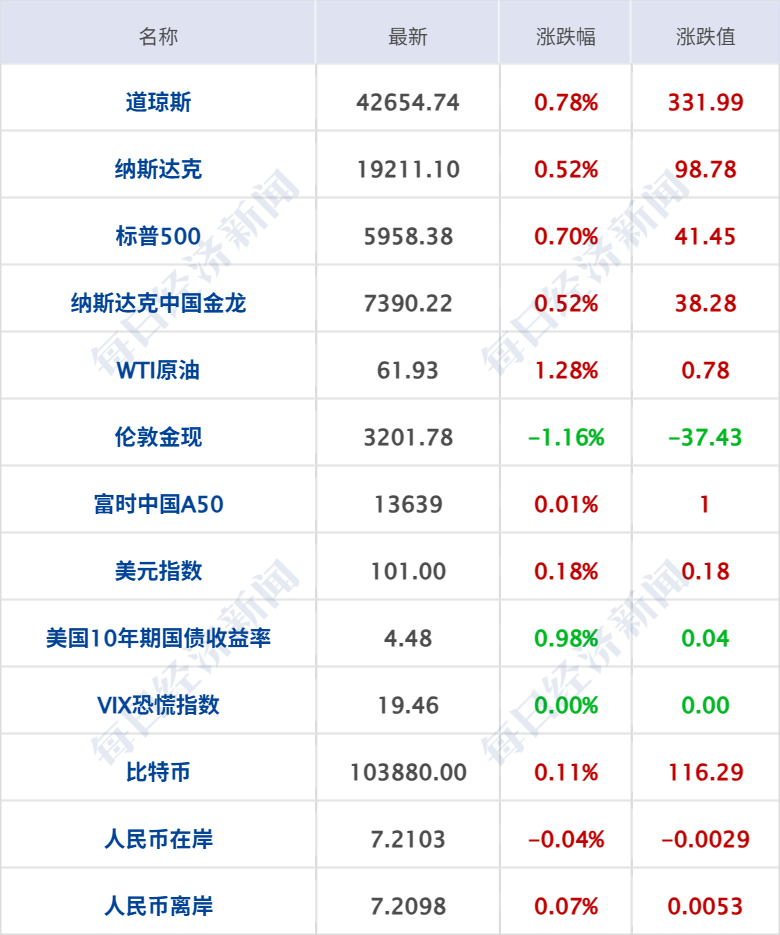 1 韩正会见美国景顺集团董事会主席瓦格纳 5月16日,国家副主席韩正在北京会见美国景顺集团董事会主席瓦格纳。韩正表示,中美之间拥有广泛共同利益和广阔合作空间。近日,中美经贸会谈取得实质性进展,两国应通过平等对话,妥善解决经贸合作中的分歧和摩擦。中国坚持以高水平开放推动高质量发展,以自身稳定性为全球经济注入确定性,将积极借鉴国际资本市场发展经验,加快符合中国国情的资本市场改革。景顺集团是中国资本市场长期参与者,欢迎集团继续加强对华合作,也希望美国工商界为推进两国关系、促进共同利益发挥更大作用。瓦格纳高度赞赏中国取得的巨大发展成就,表示景顺集团和美工商界对美中经贸会谈取得实质性进展感到高兴,将持续深耕中国市场,为促进美中经贸合作贡献力量。(新华社) 2 隔夜市场 美股三大指数集体收涨,道指涨0.78%,本周累涨3.41%;标普500指数涨0.7%,本周累涨5.27%;纳指涨0.52%,本周累涨7.15%;大型科技股多数上涨,特斯拉涨超2%,奈飞、谷歌涨超1%,微软、英伟达、亚马逊、英特尔小幅上涨;苹果、Meta小幅下跌;其中,本周英伟达累涨超16%,Meta累涨超8%,苹果累涨6.5%。中概股多数上涨,纳斯达克中国金龙指数涨0.52%,本周累计上涨4.56%;小牛电动涨12%,哔哩哔哩涨近7%,蔚来涨近3%,网易、京东跌超2%。 国际金价走低,现货黄金跌1.16%,报3201.78美元/盎司,本周累计下跌3.75%;COMEX黄金期货跌0.66%,报3205.30美元/盎司,本周累计下跌3.72%;COMEX白银期货跌0.76%,报32.43美元/盎司。 国际油价走强,美油主力合约收涨1.28%,报61.93美元/桶;布伦特原油主力合约涨1.36%,报65.41美元/桶。 欧洲三大股指收盘全线上涨,德国DAX指数涨0.3%报23767.43点,法国CAC40指数涨0.42%报7886.69点,英国富时100指数涨0.59%报8684.56点。本周,德国DAX指数涨1.14%,法国CAC40指数涨1.85%,英国富时100指数涨1.52%。 3 多个“首次”!上市公司重大资产重组新规落地 5月16日,中国证监会正式对外公布实施修订后的《上市公司重大资产重组管理办法》,在简化审核程序、创新交易工具、提升监管包容度等方面作出优化。修订后的重组办法创多个“首次”:首次建立简易审核程序;首次调整发行股份购买资产的监管要求;首次建立分期支付机制;首次引入私募基金“反向挂钩”安排。业内人士指出,监管部门在鼓励上市公司并购重组方面采取了一系列措施,重组办法作为上市公司并购重组的“基本法”,优化后将在更大程度上提振市场各方信心、提升并购积极性,赋能上市公司高质量发展。(新华社) 4 外交部:坚决反对美方对中国芯片产品和人工智能产业进行恶意封锁和打压 5月16日,外交部发言人林剑主持例行记者会。有记者就美方打压中国芯片产品和人工智能产业相关措施提问。对此,林剑表示,美方泛化国家安全概念,滥用出口管制和“长臂管辖”,无端对中国芯片产品和人工智能产业进行恶意封锁和打压,严重违反市场规则,严重扰乱全球产供链稳定,严重损害中国企业正当权益,中方对此坚决反对,绝不接受。中方敦促美方立即纠正保护主义和单边霸凌错误行径,停止对中国科技企业和人工智能产业的无底线打压。中方将采取坚决措施,维护自身发展权利和中国企业正当权益。(央视新闻) 5 商务部召开全国离境退税工作推进会 据商务部网站消息,5月15日,全国优化离境退税政策扩大入境消费工作推进会在京召开。会议深入贯彻落实党中央、国务院决策部署,交流离境退税工作经验做法,部署下一步重点工作。会议指出,发展离境退税是大力提振消费的重要抓手,是应对外部冲击的重要举措,是扩大高水平对外开放的重要途径。各地商务主管部门要积极会同相关部门,加快推进扩商店、增商品、优服务工作,着力提高退税商店覆盖面,提升退税商品吸引力,增强境外旅客获得感,扩大入境消费,为大力提振消费、推动经济持续回升向好作出积极贡献。要抓紧完善工作机制,加强部门协同,广泛凝聚合力,强化数据赋能,创新工作举措,推动离境退税政策加快落实落地。 6 官方通报 “10亿元违建豪宅” 近日,网传“耗资10亿元潮汕豪宅‘英之园’将被强制拆除”一事引发关注。5月16日晚11时,“潮阳发布”微信公众号发布情况通报:近日,我区发布“英之园”违法建筑物《强制拆除公告》一事引发社会关注。现将有关情况通报如下:“英之园”位于我区西胪镇西二社区,占地57.389亩,建筑物面积1.035万平方米,估价1.14亿元。“英之园”非法占用集体工业用地和耕地,未经审批擅自建设,侵害集体及公共利益,根据《中华人民共和国土地管理法》《中华人民共和国城乡规划法》《汕头经济特区城乡规划条例》等法律法规,对其作出行政处罚,并先后经行政复议、行政诉讼,现依法进入行政强制执行程序。针对“英之园”违建问题,纪检监察机关、司法机关深入调查,已对构成犯罪人员依法追究刑事责任,对有关部门公职人员进行严肃追责问责。接下来,我区将全面排查,依法依规严厉查处违建问题,维护群众合法权益。 7 金融监管总局发布银行业保险业最新数据 5月16日,据国家金融监督管理总局网站,金融监管总局发布2025年一季度银行业保险业主要监管指标数据情况。 数据显示,一季度银行业和保险业总资产保持增长。一季度末,我国银行业金融机构本外币资产总额458.3万亿元,同比增长6.7%。其中,大型商业银行本外币资产总额198.5