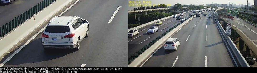 ▲2024年8月23日7时42分,号牌为川B25***的小型普通客车在延安高架南侧近沪青平立交出口路段,实施了“机动车违反禁令标志指示的(高架道路限行)”违法行为。
