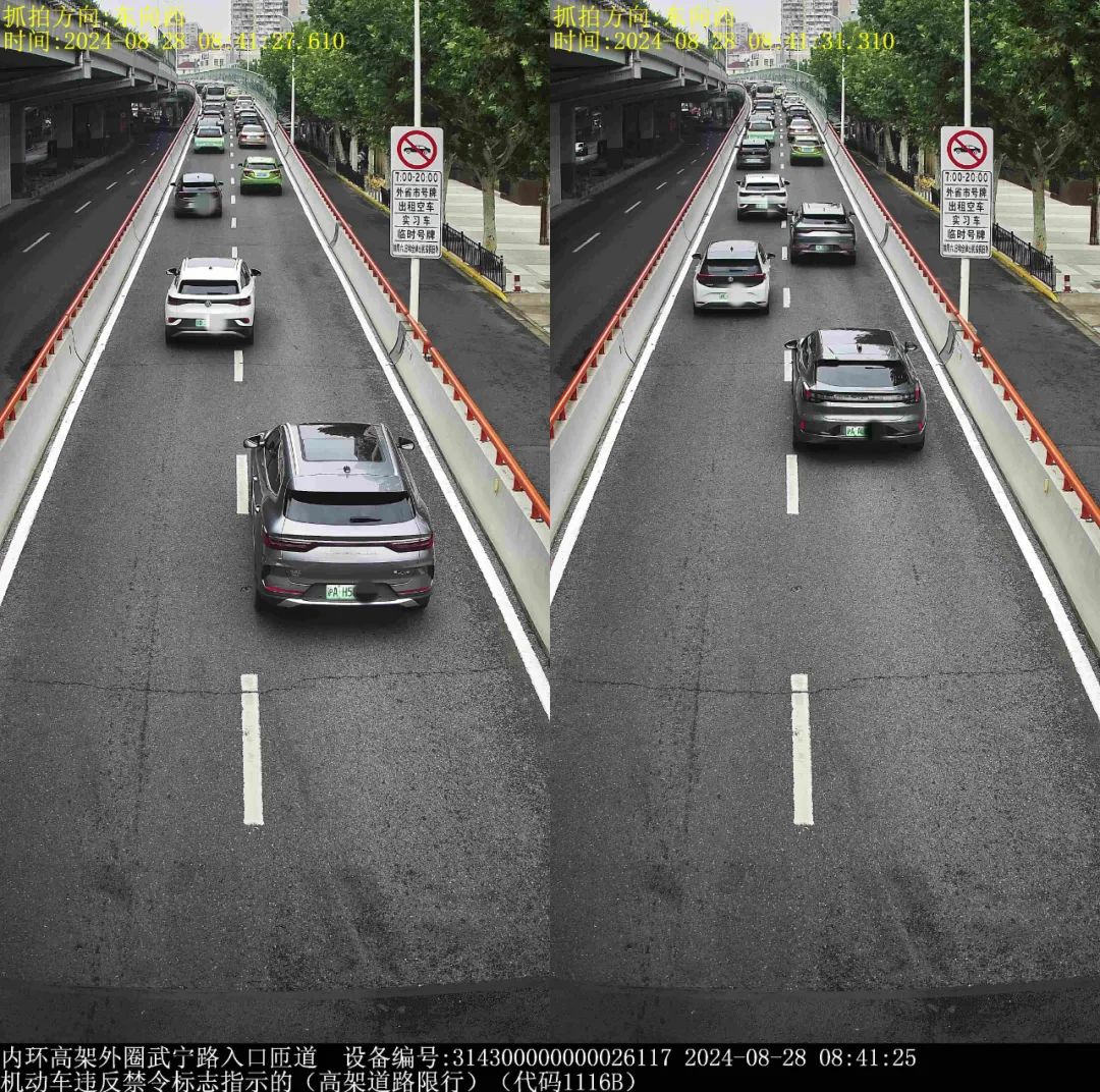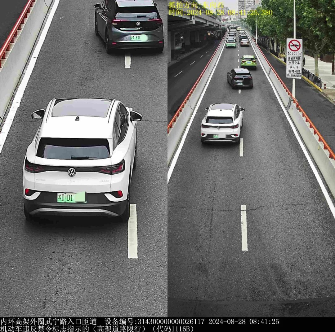 ▲2024年8月28日8时41分,号牌为苏DD14***的小型普通客车在内环高架外圈武宁路入口匝道,实施了“机动车违反禁令标志指示的(高架道路限行)”违法行为。