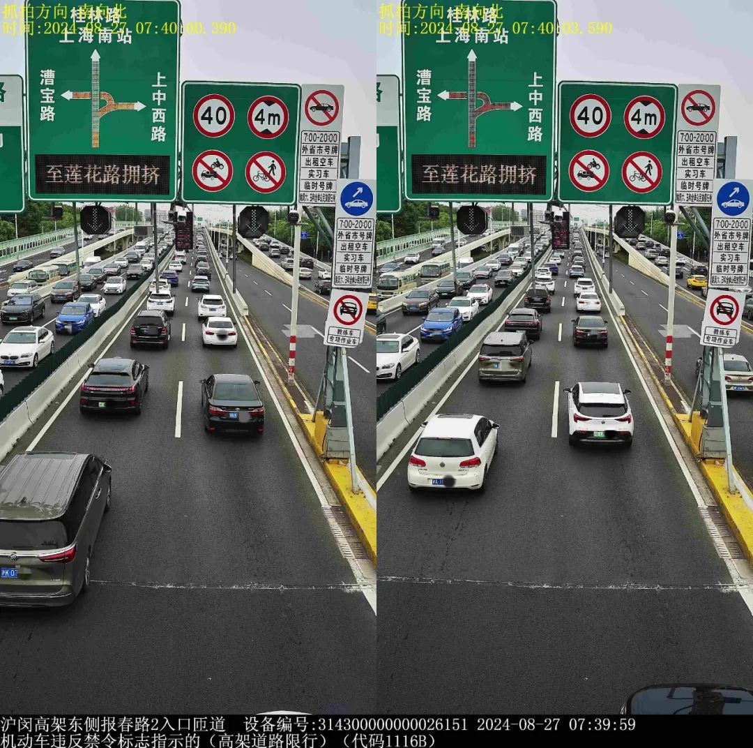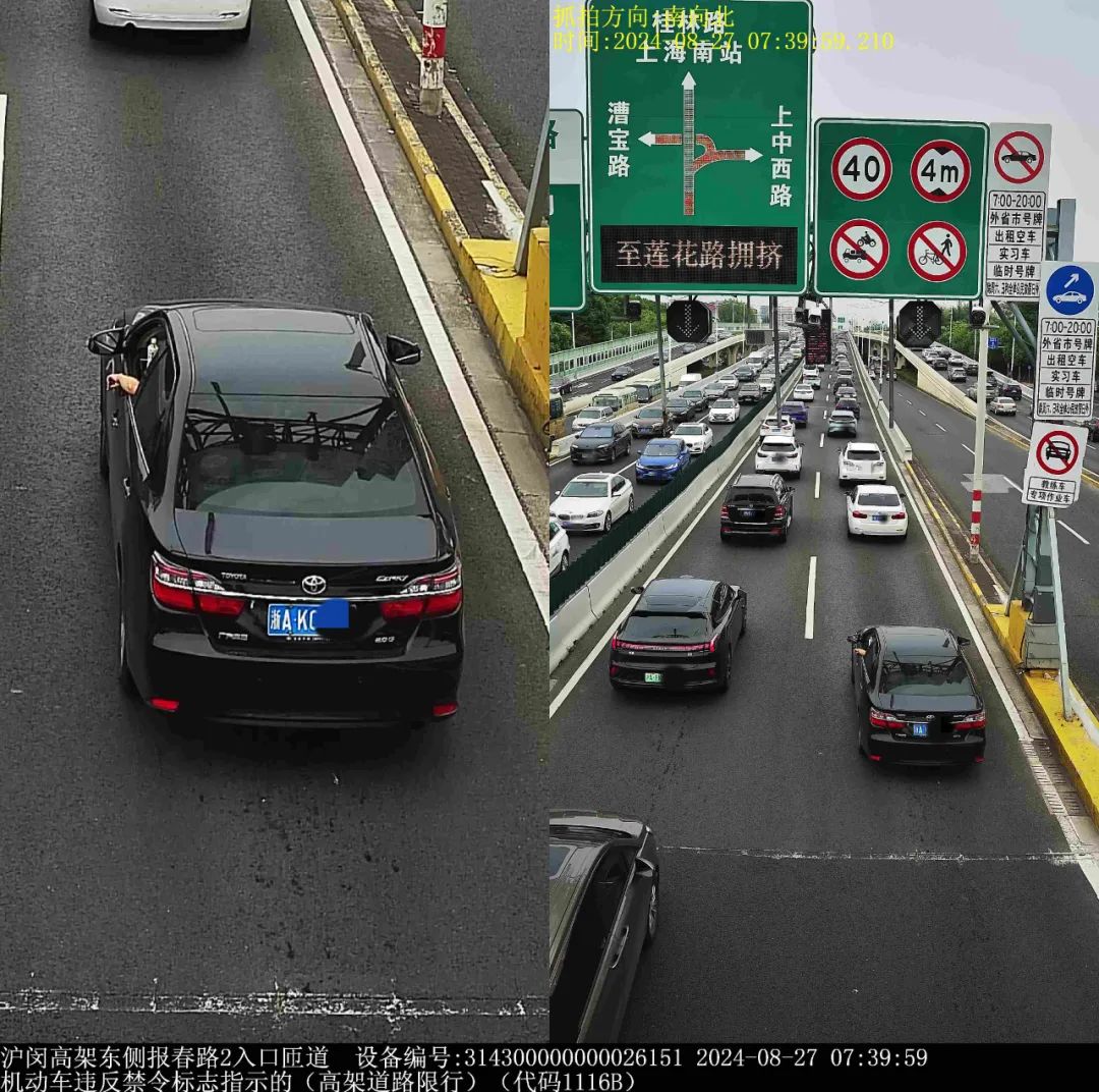 ▲2024年8月27日7时39分,号牌为浙AK0***的小型轿车在沪闵高架东侧报春路2入口匝道,实施了“机动车违反禁令标志指示的(高架道路限行)”违法行为。