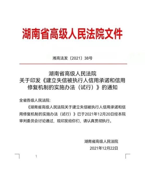 为推进湖南社会信用体系建设,营造诚实守信的营商环境,促使被执行人自觉履行生效法律文书确定的义务,近日,湖南高院制定下发《湖南省高级人民法院关于印发《建立失信被执行人信用承诺和信用修复机制的实施办法(试行)》。《实施办法》共26条,包括信用承诺和信用修复的一般规定、程序权利保障、信用承诺、信用修复、其他规定、附则等六个方面的内容。