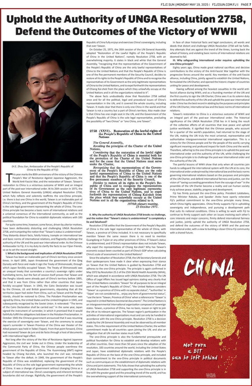 2025年5月19日和20日,驻斐济大使周剑在斐济主流报纸《斐济太阳报》和《斐济时报》发表题为《维护联大第2758号决议权威,捍卫二战胜利成果》的署名文章,全面介绍台湾问题历史经纬,深入阐释中方在台湾问题上的原则立场,批驳“台湾地位未定”谬论,呼吁国际社会共同维护联大第2758号决议权威、捍卫二战胜利成果和战后国际秩序。全文如下: