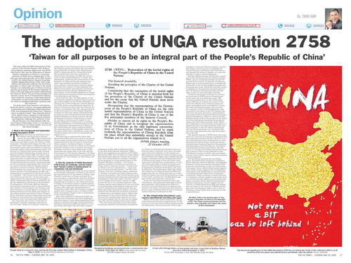 上述事实不容置疑地表明,联大第2758号决议从政治上、法律上和程序上彻底解决了包括台湾在内全中国在联合国的代表权问题,明确了世界上只有一个中国,台湾是中国的一部分,而不是一个国家;明确了中国在联合国的席位只有一个,中华人民共和国政府是唯一合法代表,不存在“两个中国”、“一中一台”。