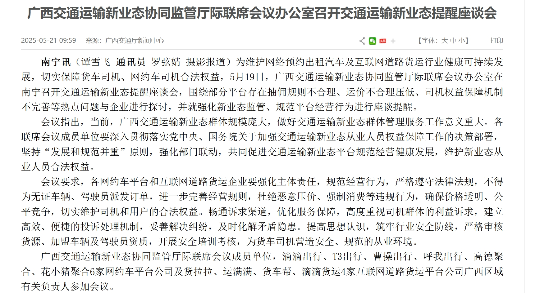 为维护网络预约出租汽车及互联网道路货运行业健康可持续发展,切实保障货车司机、网约车司机合法权益,5月19日,广西交通运输新业态协同监管厅际联席会议办公室在南宁召开交通运输新业态提醒座谈会,围绕部分平台存在抽佣规则不合理、运价不合理压低、司机权益保障机制不完善等热点问题与企业进行探讨,并就强化新业态监管、规范平台经营行为进行座谈提醒。