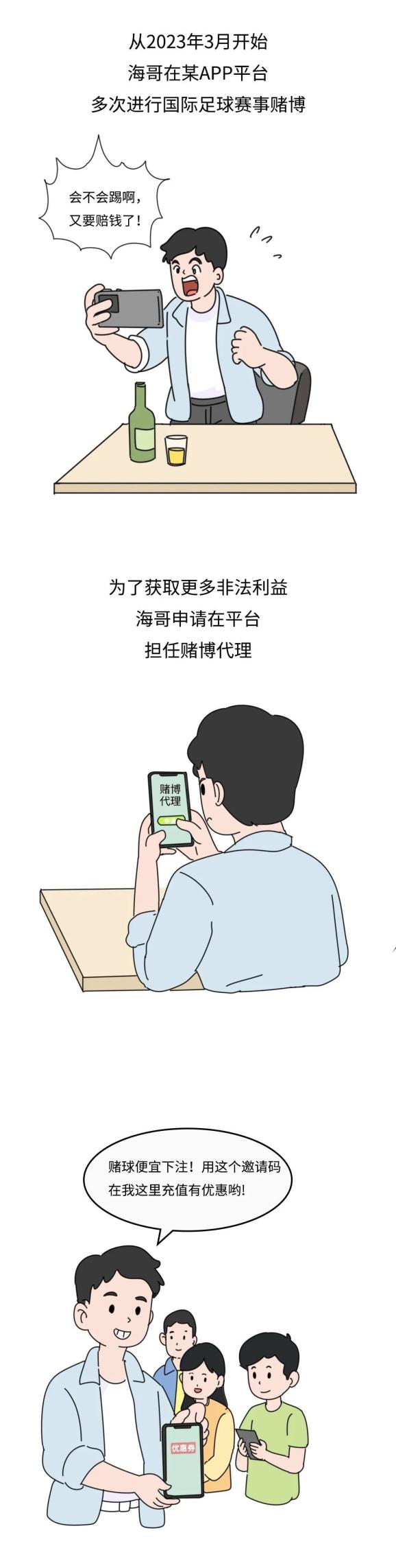 2023年3月,海哥利用手机在某APP多次进行国际足球赛事赌博,为进一步获取更多的非法利润,海哥申请在此平台网络担任赌博代理,并使用代表其代理身份的邀请码、邀请链接发送给下线人员7名一级会员以及1名二级会员。