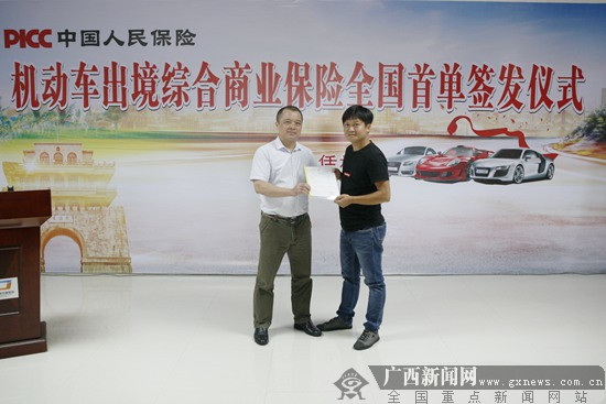 广西新闻网南宁9月6日讯(通讯员 廖勇健)9月5日,中国人保财险广西分公司在广西凭祥召开发布会,正式签发了机动车出境综合商业保险我国第一单,填补了行业出境机动车保险产品的空白,也成为中国人保支持国家“一带一路”建设的鲜活案例。自治区金融办、保监局、交通厅、崇左市政府、凭祥市政府等部门领导出席了发布会,中国人保崇左市分公司总经理邓进乾为第一位客户送上保险单及服务卡。