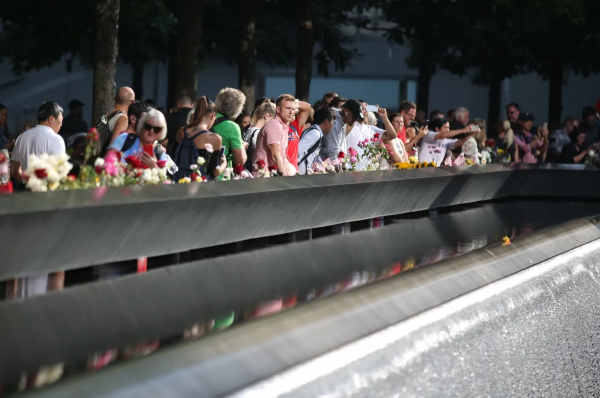 2019年 9月11日,在美国纽约的“9·11”纪念广场,人们在刻有遇难者姓名的纪念池旁悼念遇难者。当日是美国“9·11”事件18周年纪念日。新华社发