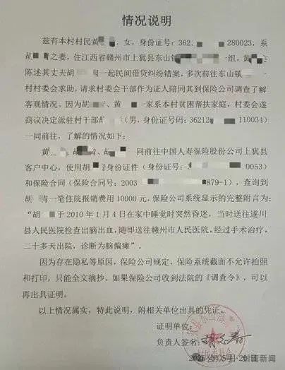 黄女士一家遭遇的蹊跷案件,让村子里的人很同情。5月20日,村委会出具了书面证明材料,称其家庭为贫困帮扶家庭,村委会驻村干部陪同前往保险公司,调取了胡某青的保险报销信息,证明胡某青2010年1月4日因脑出血住院20多天,后诊断为脑偏瘫。