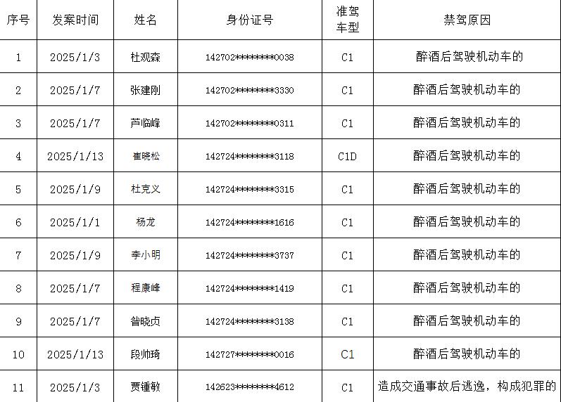 2025年5月,为有效惩治严重交通违法行为,大力维护良好的道路交通秩序,确保人民群众出行安全,运城交警不断加大对各类严重交通违法行为的查处和打击力度,依法对醉驾、驾驶报废车、拼装车、涉嫌交通肇事罪等严重交通违法行为的当事人做出吊销机动车驾驶证或者终身禁驾的处罚,被吊销机动车驾驶证的11人进行曝光,希望广大驾驶人引以为戒,牢记安全,守法驾驶。