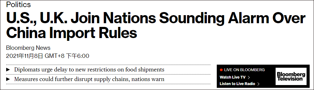 但彭博社11月8日报道称,这引发欧美7个经济体的不满,试图“组团”向中方施压。根据彭博社拿到的一份文件副本,美国、英国、日本、欧盟、澳大利亚、加拿大和瑞士的外交人员曾在10月27日向我海关总署递交联名信,希望将上述新规推迟“至少18个月”。