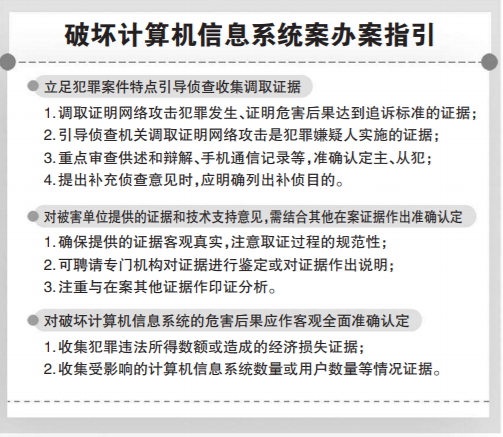 三是认定危害后果的审查规则。对于破坏计算机信息系统的危害后果,实践中往往倾向于依据犯罪违法所得数额或造成的经济损失认定。但是在一些案件中,违法所得或经济损失并不能全面、准确反映犯罪行为所造成的危害。有的案件违法所得或者经济损失的数额并不大,但网络攻击行为导致受影响的用户数量特别大,有的导致用户满意度降低或用户流失,有的造成了恶劣社会影响。对这类案件,如果仅根据违法所得或经济损失数额来评估危害后果,可能会导致罪刑不相适应。因此,办理破坏计算机信息系统犯罪案件时,注意从维护公共秩序的角度,收集、固定能够证实受影响的计算机信息系统数量或用户数量、受影响或被攻击的计算机信息系统不能正常运行的累计时间、对被害企业造成的影响等证据,对危害后果作出客观、全面、准确认定,做到罪责相当、罚当其罪。
