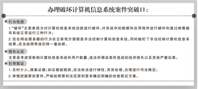 一是在破坏计算机信息系统罪中的行为性质的认定方面。根据刑法第286条破坏计算机信息系统罪的规定,“破坏”主要表现为对计算机信息系统功能进行破坏、对系统中的数据和应用程序进行破坏和通过病毒破坏系统正常运行三种行为。