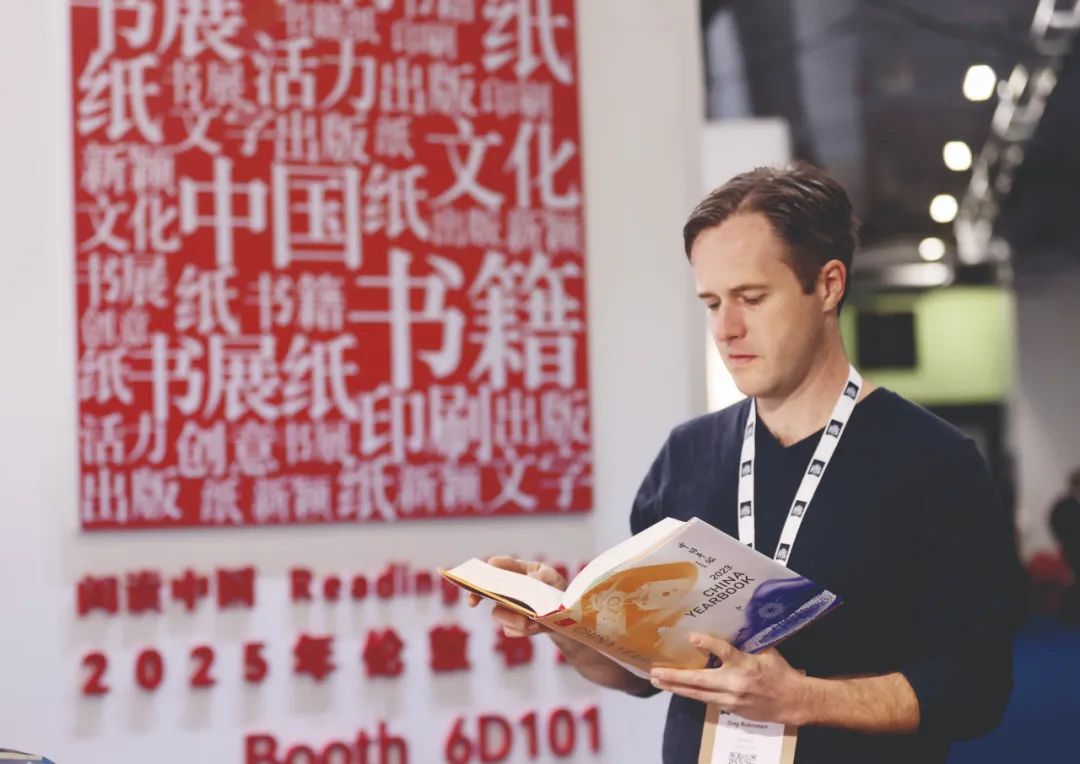 >>3月12日,在英国伦敦书展中国出版单位的联合展台,一名参观者阅读《中国年鉴2023》(英文版)。 新华社记者 李颖/摄