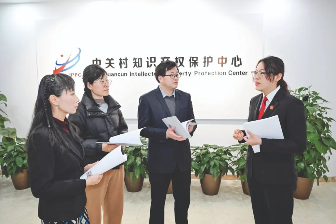 >>3月7日,在北京市海淀区中关村知识产权保护中心,海淀区人民法院法官李思頔(右一)与该中心工作人员交流知识产权保护工作。 新华社记者 黄博涵/摄