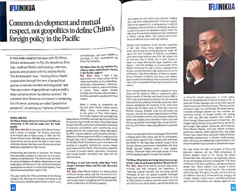 周大使:长期以来,中国对斐济奉行的是友好合作的政策。中斐建交50年来,为斐济修建道路、桥梁,建造医院、学校,提供路灯、奖学金,深受斐济民众欢迎,多数斐济媒体都给予充分肯定和积极评价。但我也注意到一个现象,每当中斐合作取得实质性进展,一些域外媒体或所谓媒体人就会蓄意散播涉华不实言论,意在挑拨两国关系、破坏友好合作。中方对此坚决反对。
