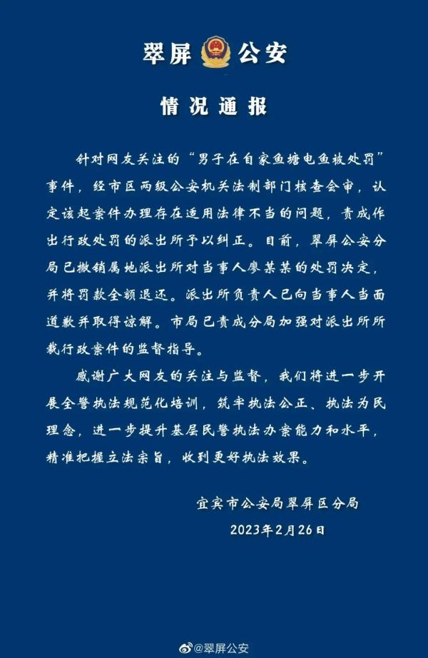 2月26日,四川省宜宾市公安局翠屏区分局官方微博发布通报:针对网友关注的“男子在自家鱼塘电鱼被处罚”事件,经宜宾市、翠屏区两级公安机关法制部门核查会审,认定该起案件办理存在“适用法律不当”的问题,责成作出行政处罚的派出所予以纠正。
